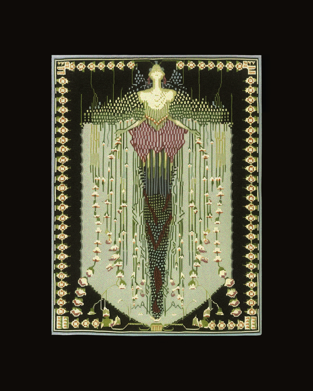 This weaving portrays a goddess-like figure rising from cascading floral forms. Its vertical rhythms and intricate motifs evoke sacred groves and ancient fertility symbols, inviting reflection on feminine divinity, renewal, and the deep connection between myth and nature.