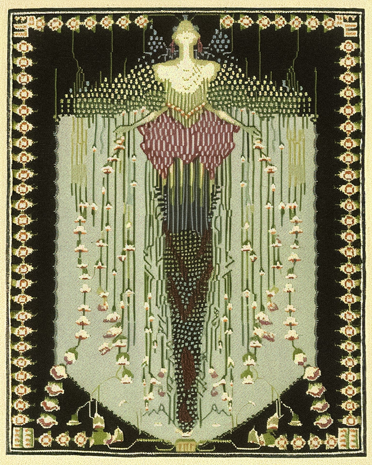This archival fine art print features a goddess-like figure emerging from cascading floral forms. Adapted from the original tapestry design, its vertical rhythms and intricate motifs evoke sacred groves and ancient symbols of renewal, inviting contemplation of feminine divinity and the mythic ties between nature and spirit.
