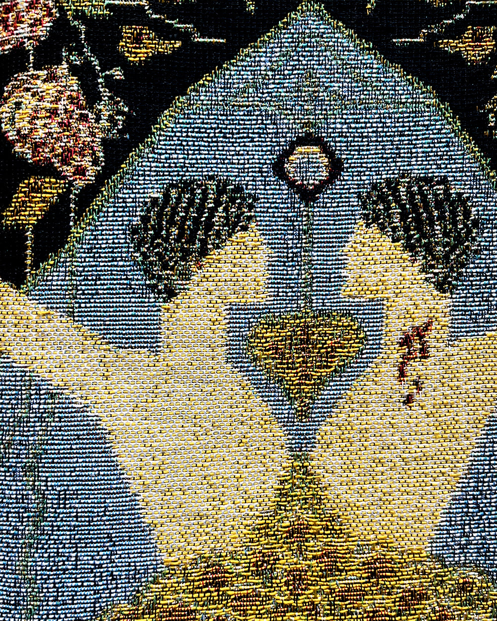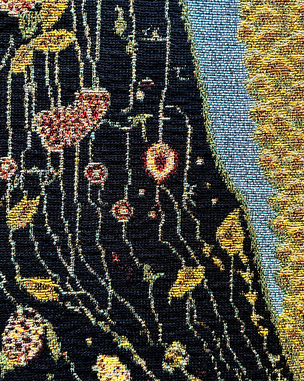 A cotton jacquard weaving depicting mirrored figures held within an intricate botanical field. Its balanced composition and detailed floral motifs evoke mythic themes of decay, renewal, and quiet transformation. The work’s interplay of texture and symbolism invites viewers to reflect on the moment where life and surrender meet.