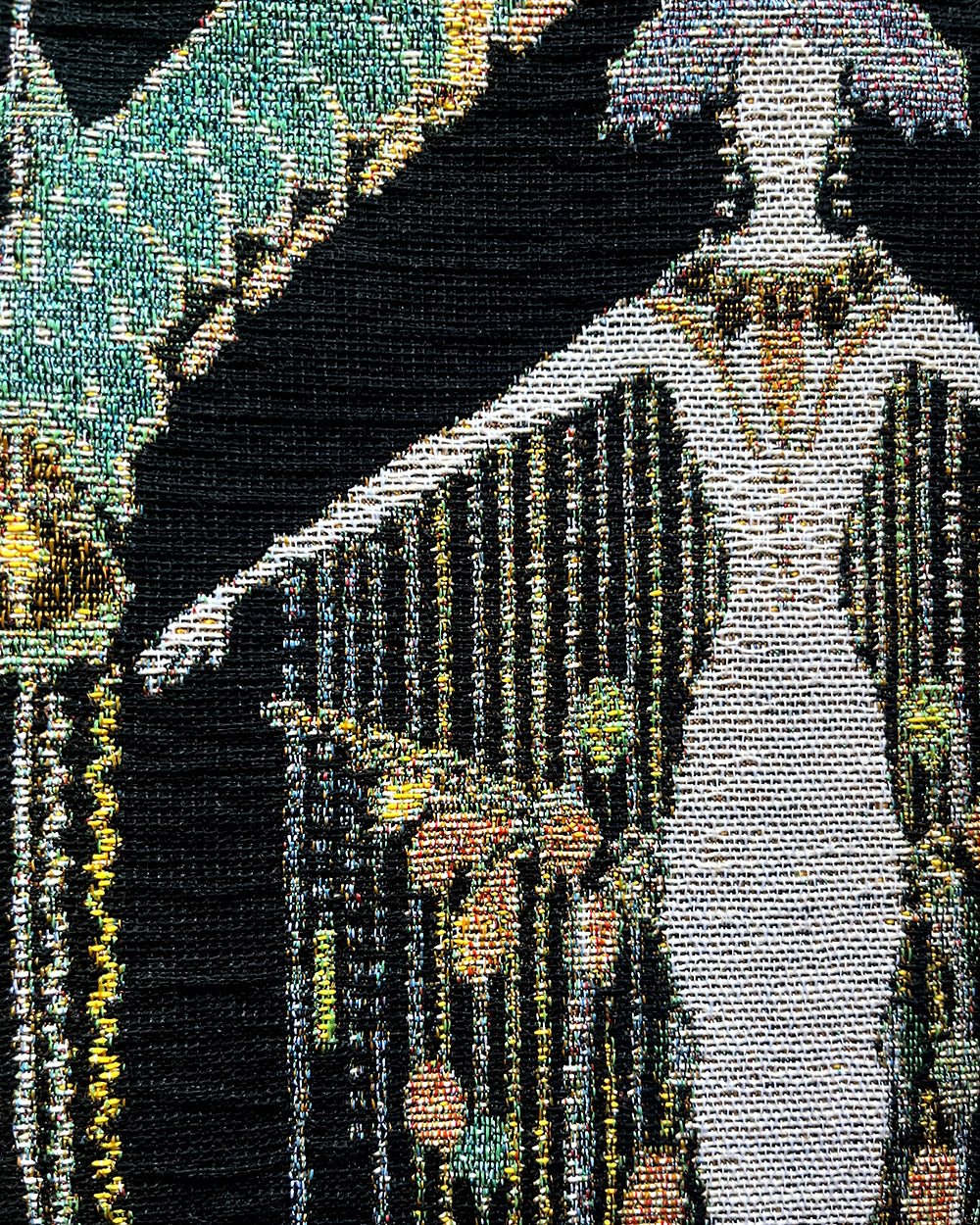 This weaving depicts a mythic, water-formed figure surrounded by cascading patterns that echo currents and droplets. Its intricate motifs and luminous palette evoke transformation and fluidity, inviting viewers to consider the shifting boundary between the human and the elemental.